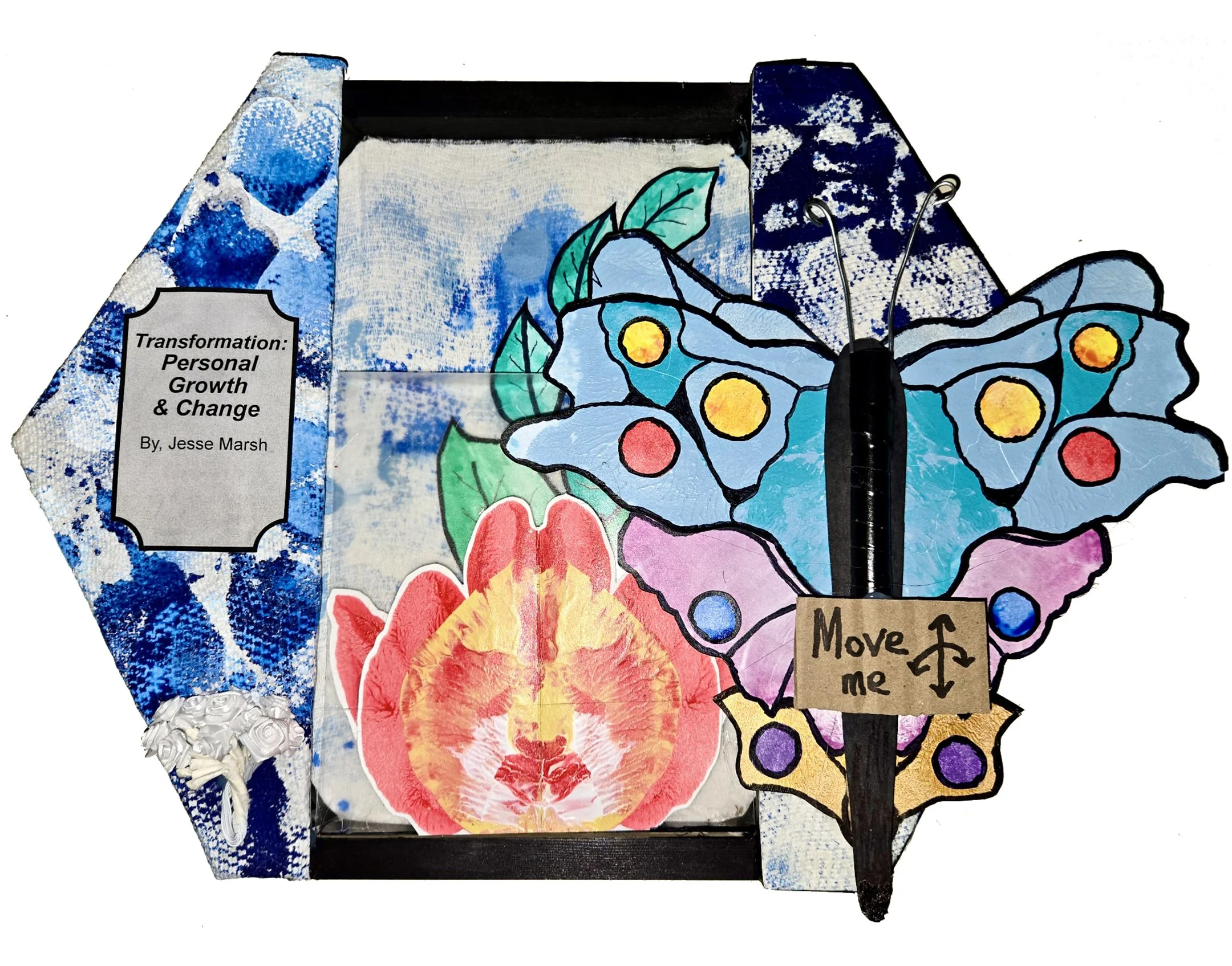 Jesse's Transformation unfolds across a hexagonal canvas, from a nascent white bloom to a vibrant red flower, culminating in a butterfly's flight. Internal Nimbus captures the radiant inner beauty, while External Nimbus depicts that inner glow emanating outwards, visualizing the intangible essence of the human spirit.